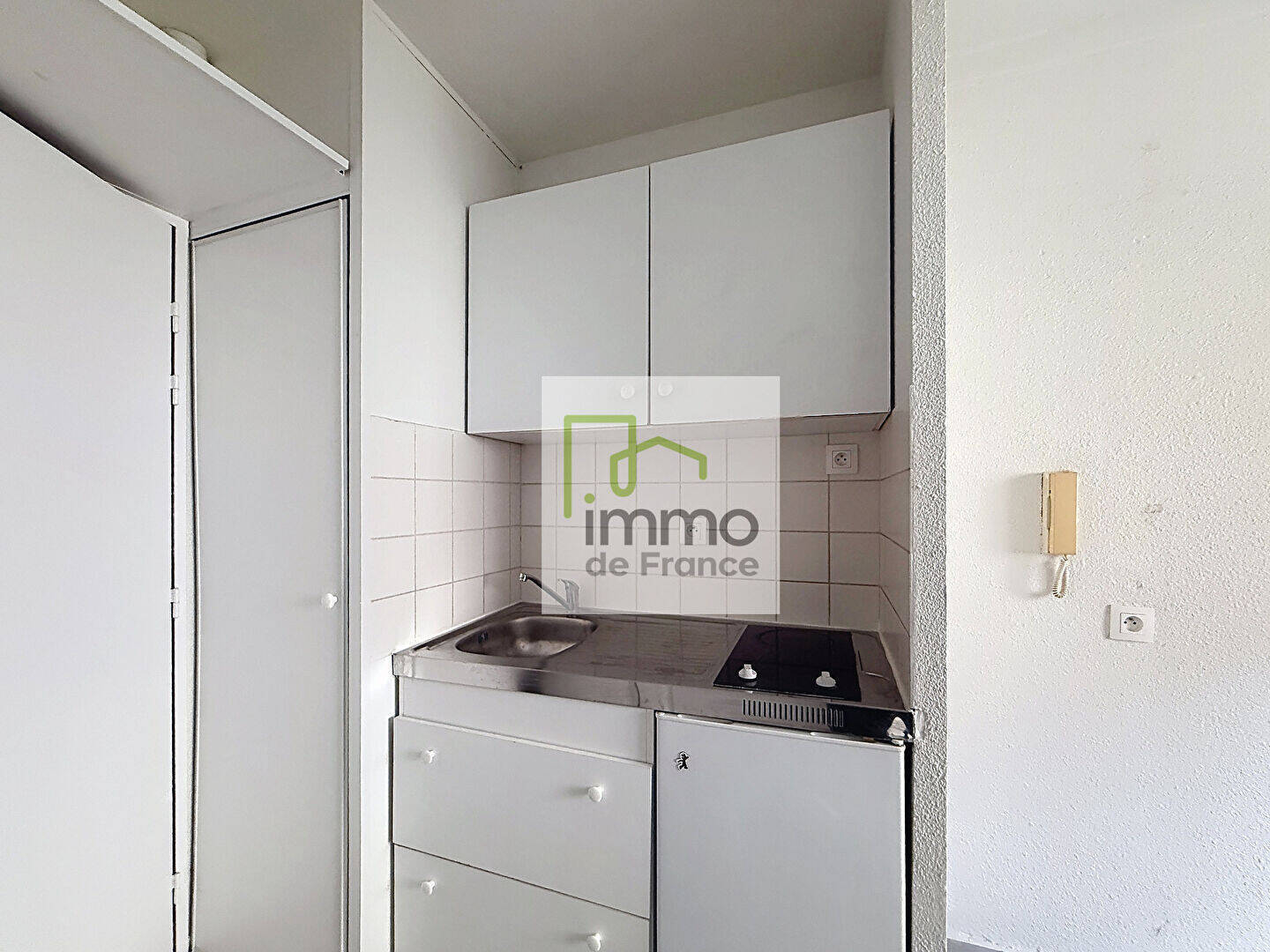 Il vous offre un hall d'entrée (placards), une pièce principale avec kitchenette (bloc évier, réfrigérateur, plaques de cuisson)
