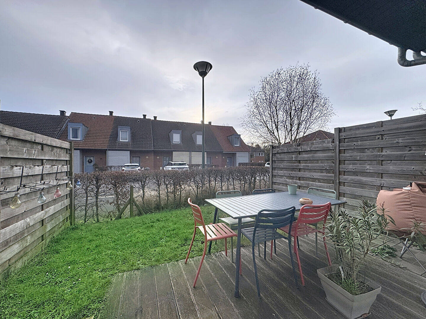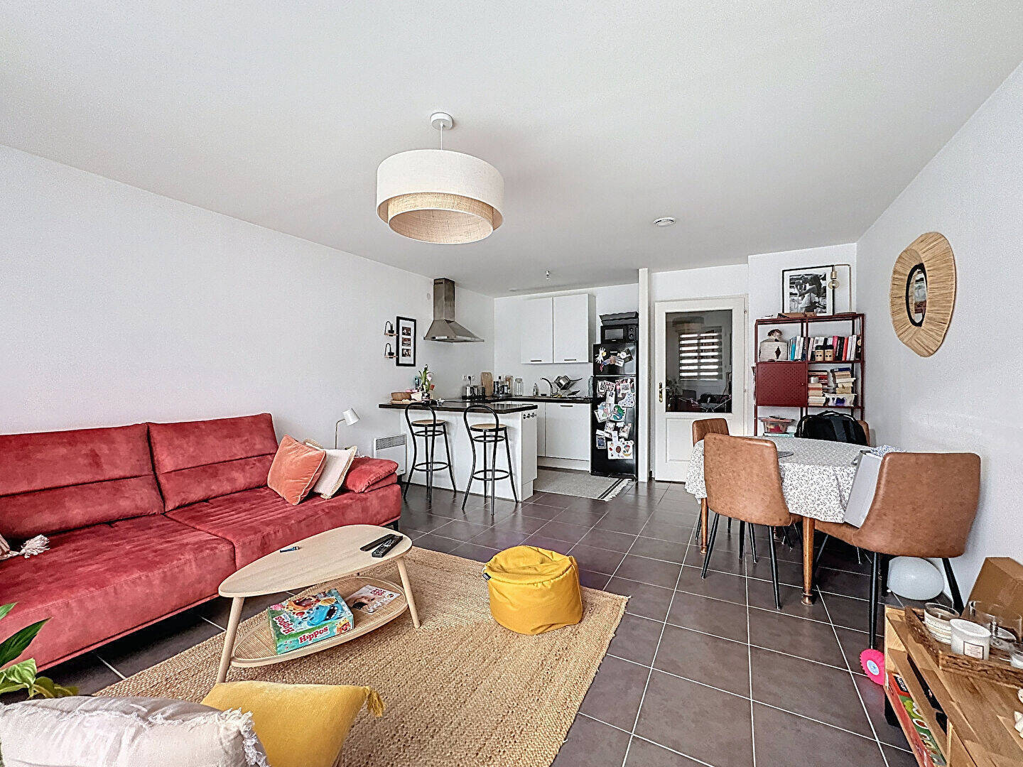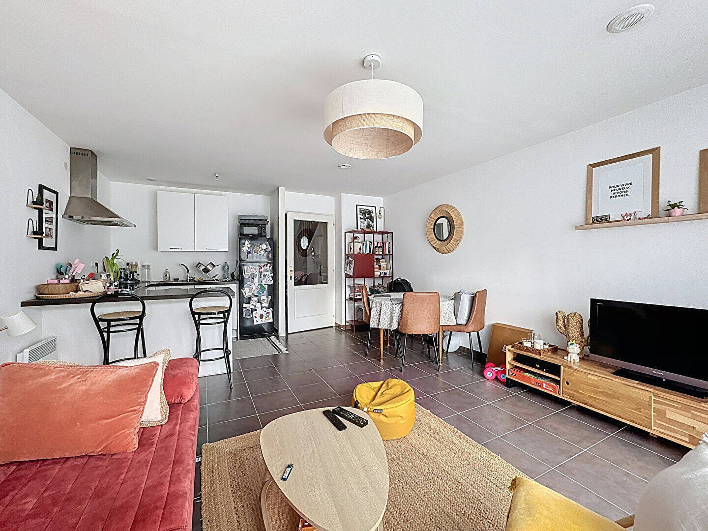 Belle maison deux chambres de 72m² comprenant une entrée avec rangements et WC séparés, un séjour carrelé lumineux avec sa cuisine équipée et son accès sur terrasse et jardin à jouissance privatif.